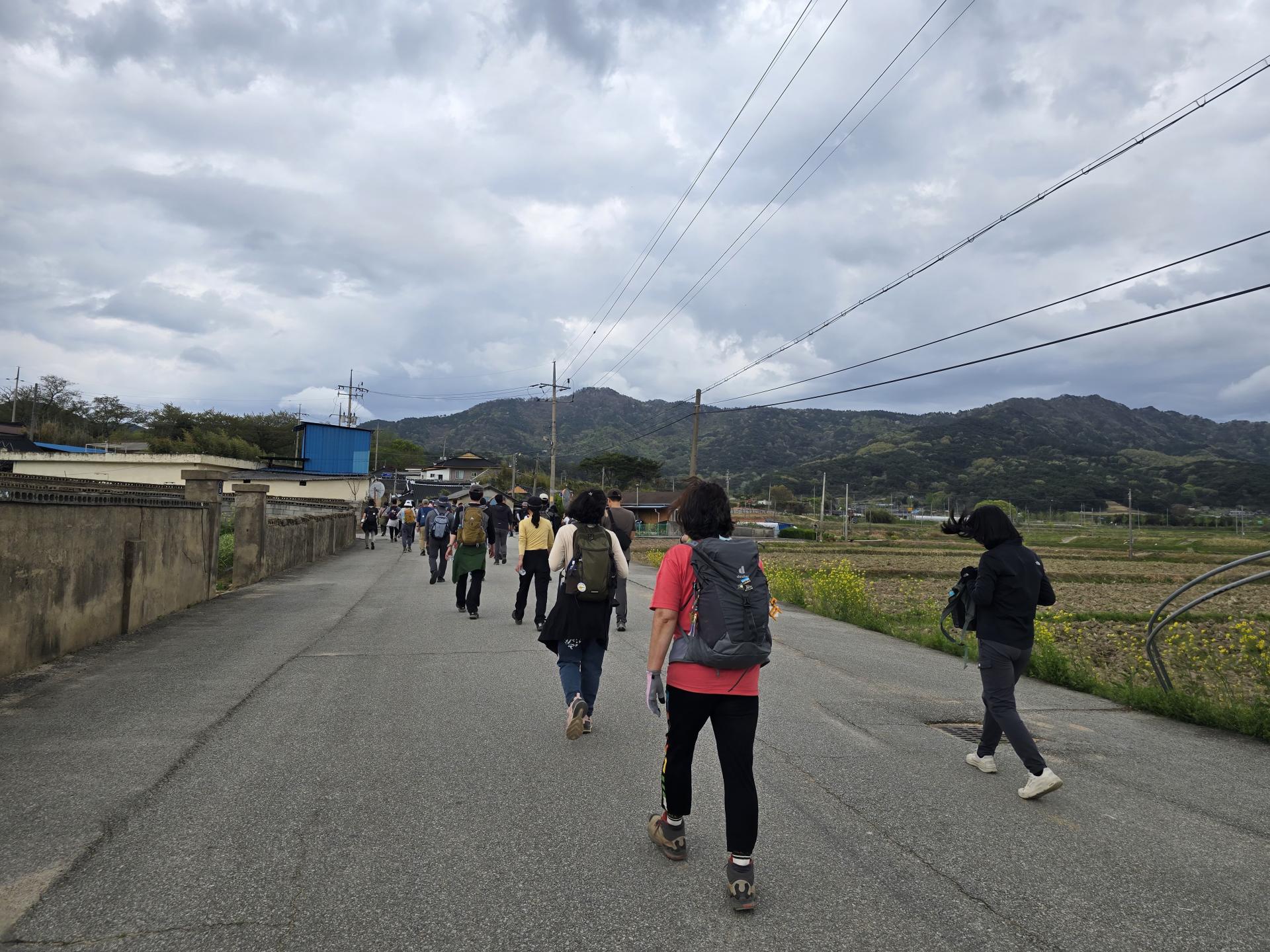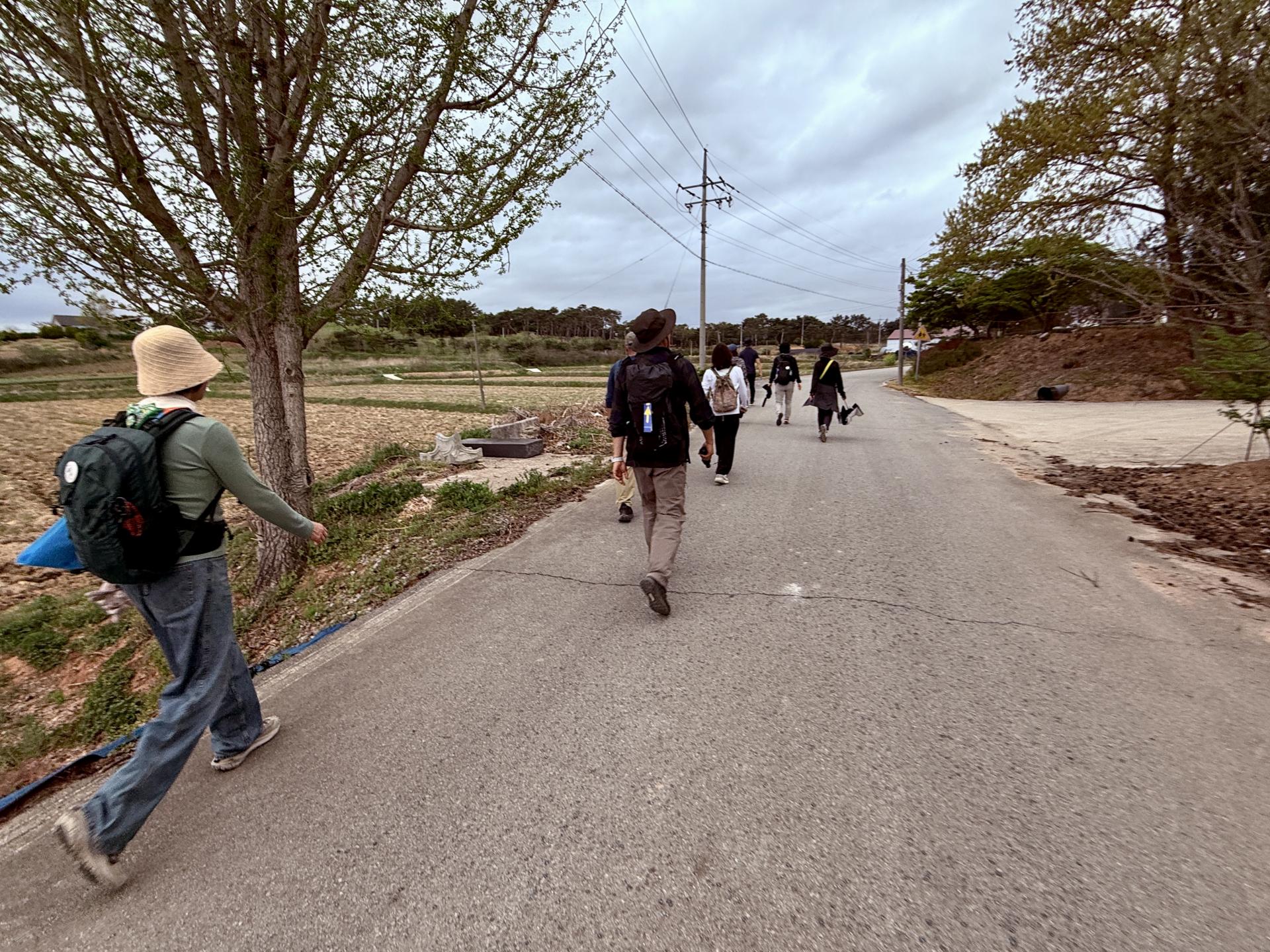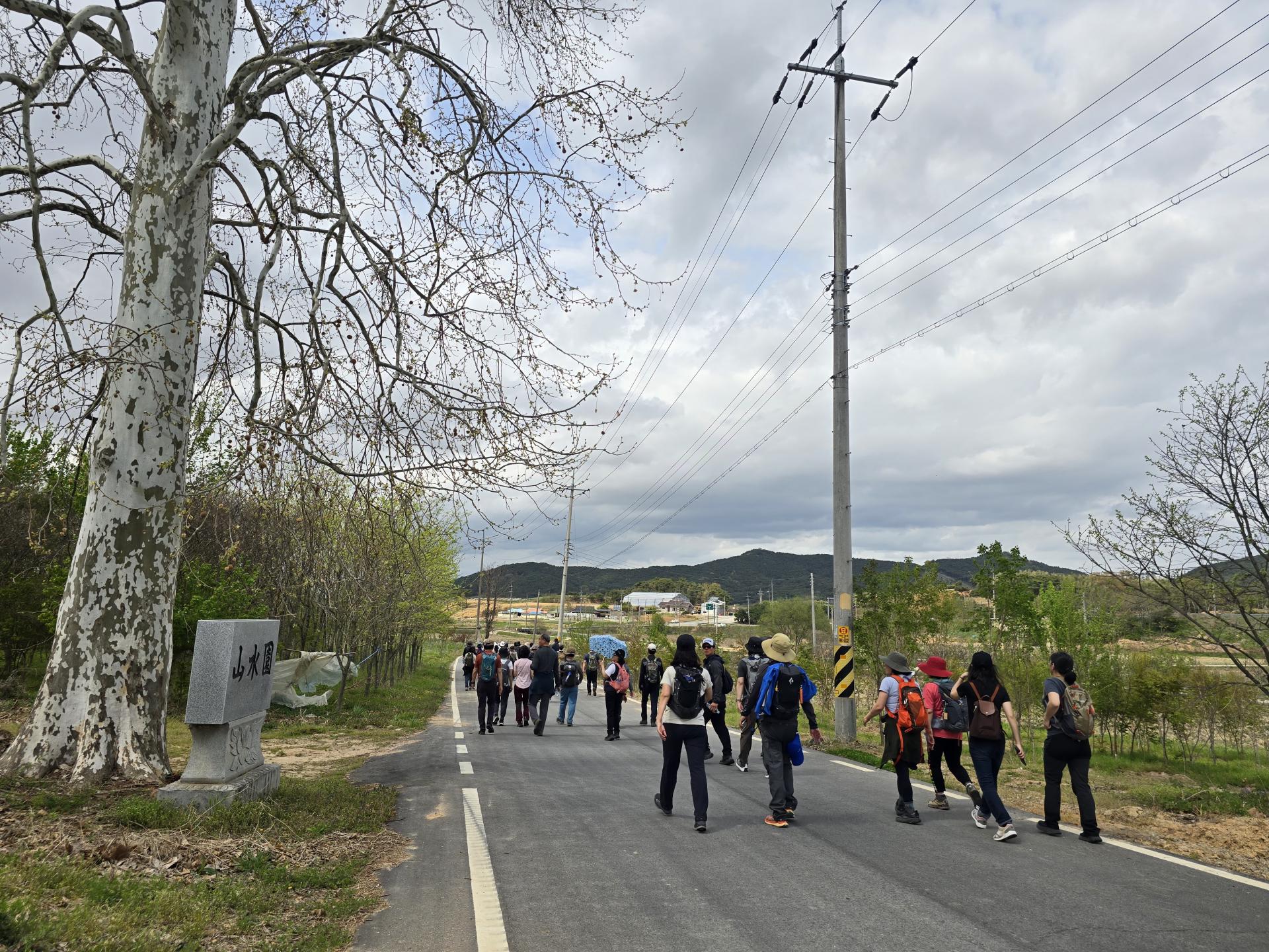 1코스 산수마을에서 여백의 길 위에서는 누구나 평등하고 평화롭고 자유롭고 행복하게 라고 외치며 출발했습니다. 마을 입구에 커다란 플라타너스가 있었고 그 플라타너스 꼭대기에 새 집이 걸려 있었습니다. 바닥에 여백의길 Y자를 보면서 저 멀리 전봇대 네모난 점을 보면서 여기가 여백이 있는 길이다 라고 찾아가는 하루였습니다.