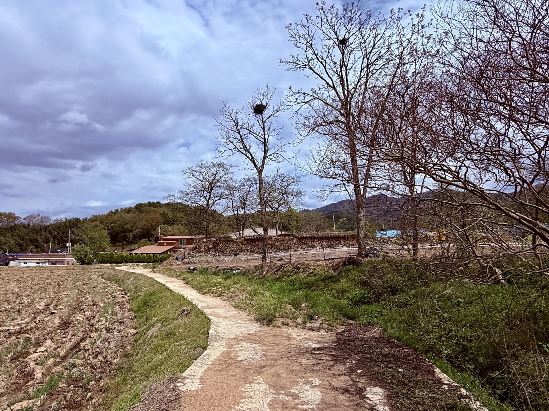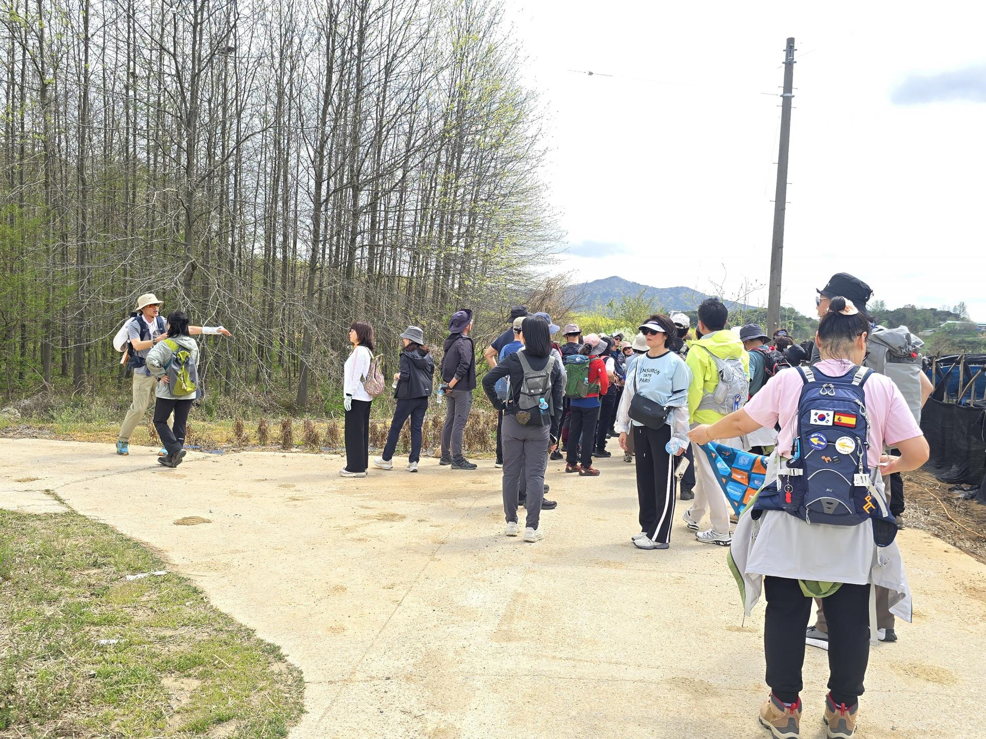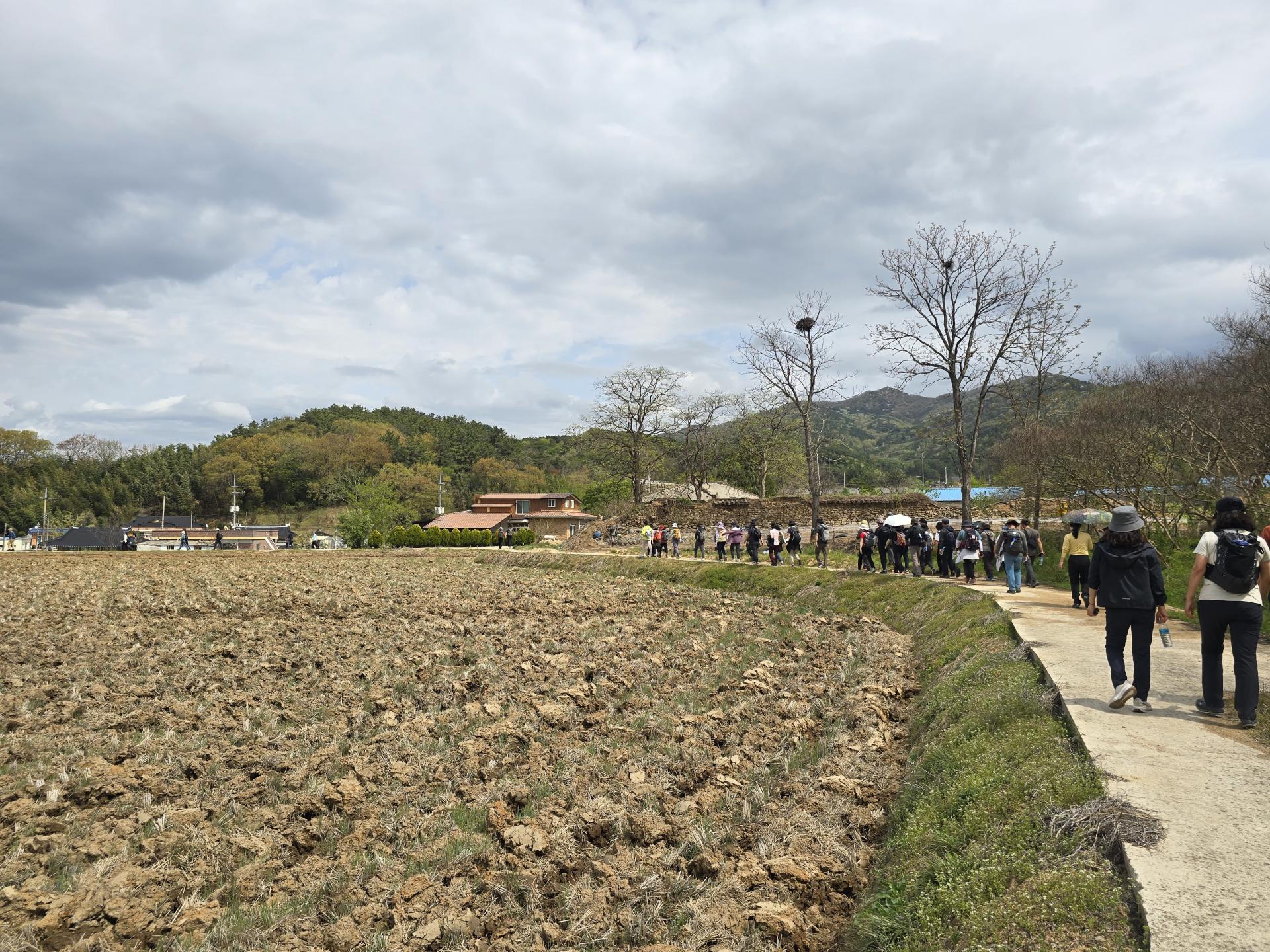 1코스 산수마을에서 여백의 길 위에서는 누구나 평등하고 평화롭고 자유롭고 행복하게 라고 외치며 출발했습니다. 마을 입구에 커다란 플라타너스가 있었고 그 플라타너스 꼭대기에 새 집이 걸려 있었습니다. 바닥에 여백의길 Y자를 보면서 저 멀리 전봇대 네모난 점을 보면서 여기가 여백이 있는 길이다 라고 찾아가는 하루였습니다.
